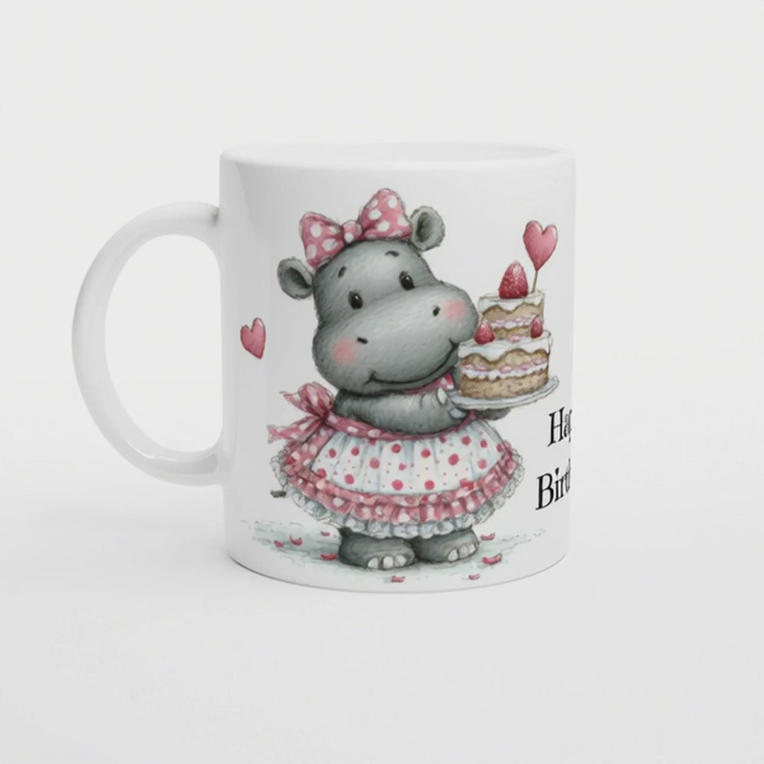 Happy Birthday Hippo | Süße Nilpferd Tasse mit Kuchen | Geschenkidee zum Geburtstag für Freundin, Kollegin oder Kind | weiß, Keramik, 330 ml