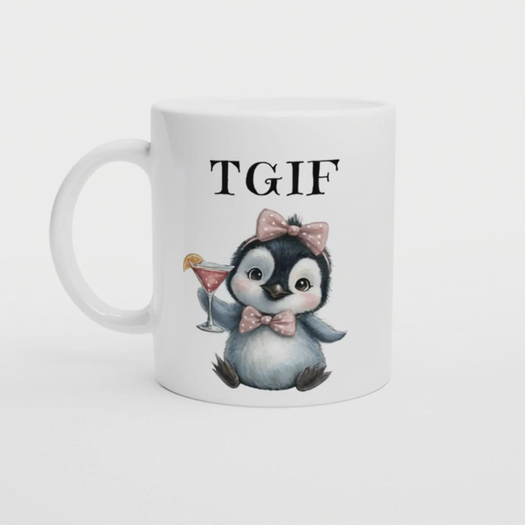 TGIF | Lustige Pinguin Tasse | Geschenkidee für Freundin oder Kollegin | Witzige weiße Keramiktasse mit Cocktail und Humor